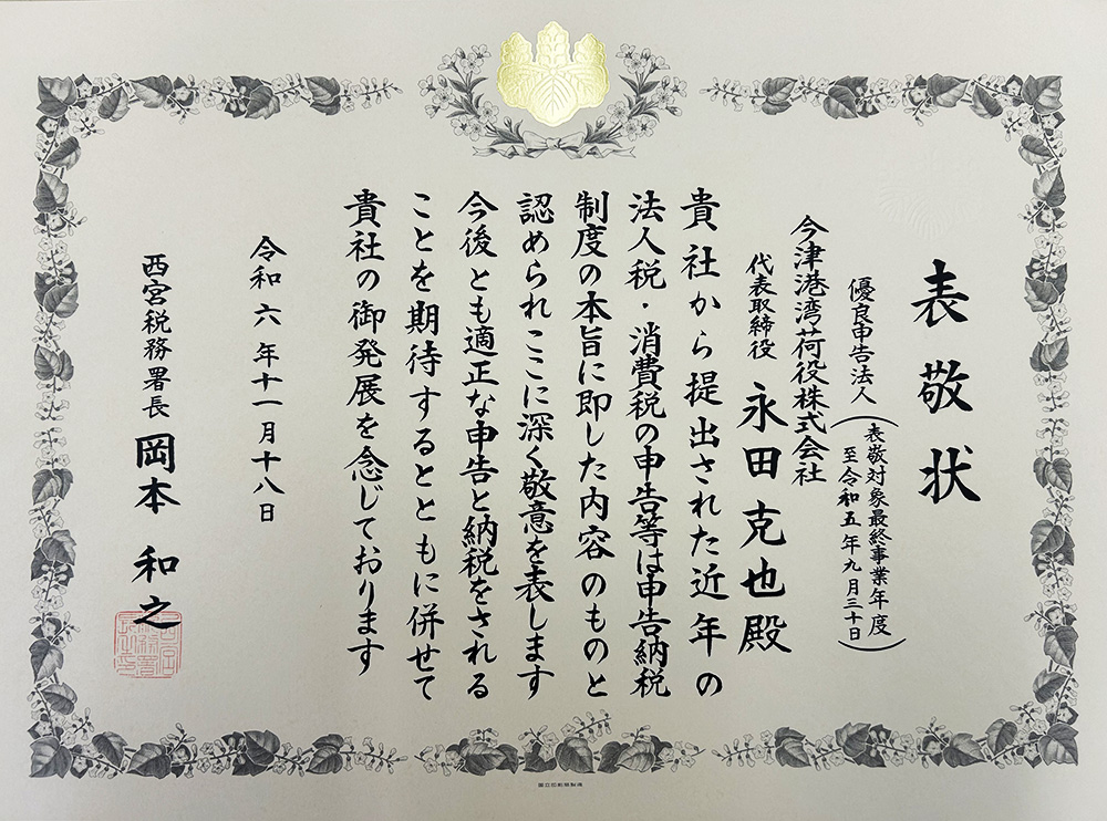 西宮税務署より、令和6年度「優良申告法人」に認定されました。